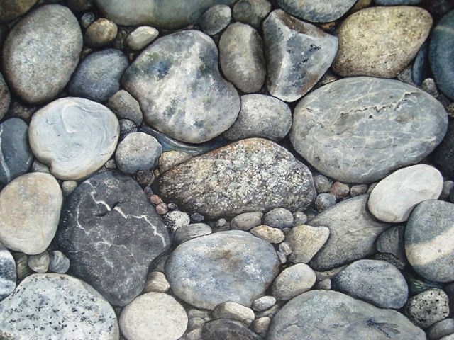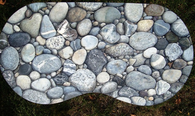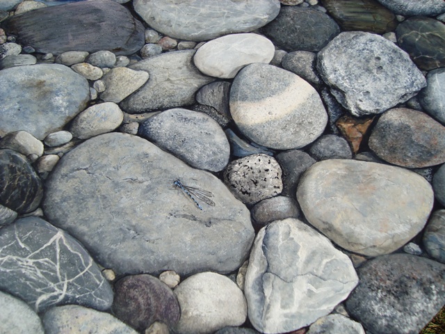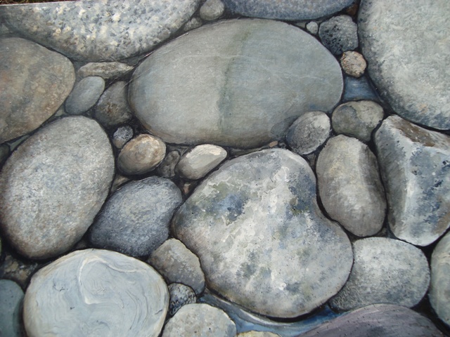 What a joy it was to paint this table! I worked from real stones and photographs of real stones. It was a challenge to make the randomness of the stones both natural and artistically placed. Painting realistic stones takes a combination of technique, patience and old brushes that can be handled ‘roughly.’ Doing the stripes that naturally occur in some stones is not easy, if done wrong the stripe would seem painted’ on the outside. The client requested “No pink or brown stones”, but the piece needed the hints of rust, yellow and green or else the all gray palette would have been too cold. Of course there has to be a bug on the stones! A delicate Damselfly was perfect for what appears to be a scene from the water’s edge. Everyone who has seen this table points to a different stone as their favorite. Which one is your favorite? I painted the legs in four alternating shades of gray. When this table was originally brought to me it was painted an ugly bright yellow, what a transformation!