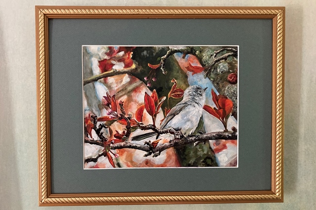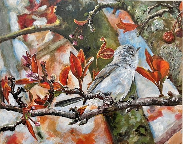 This is a Gnatsnatcher bird sitting in a springtime Crab Apple tree. The painting is dedicated to my late cousin Heidi whose wonderful bird photo was my inspiration. It is 8″ X 10″ on wood. It sold before it was even completed!