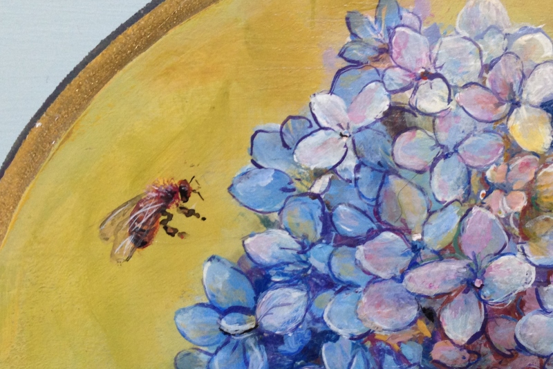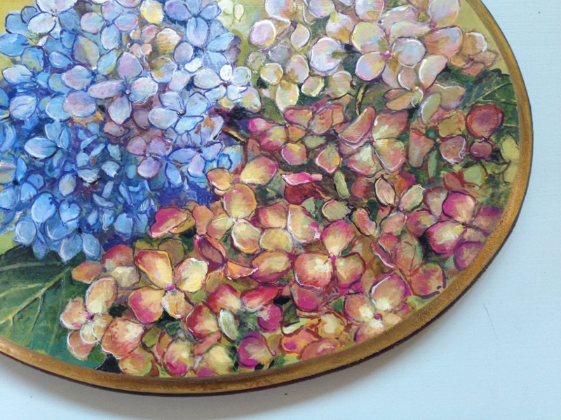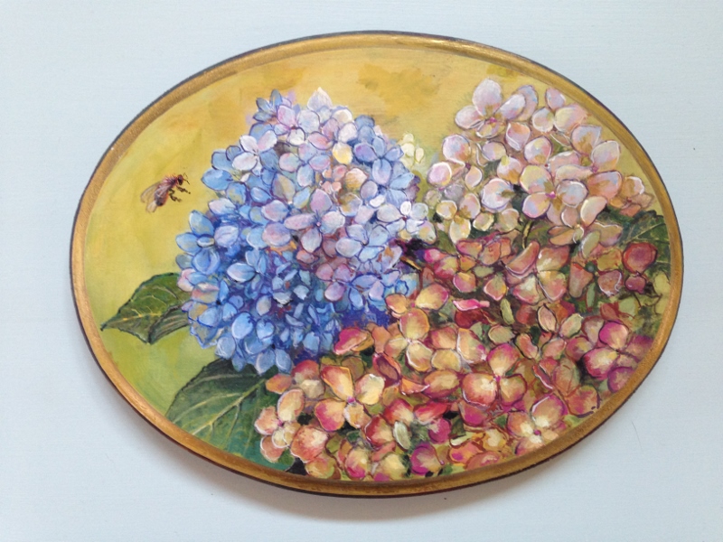 Sometimes commissions come in clusters requesting the same subject matter; this winter it was plaques with Hydrangeas. With the first one I was inspired by the colors Hydrangeas morph into come the autumn.  There is a Honey bee coming by to visit. This piece is about 6″ across.