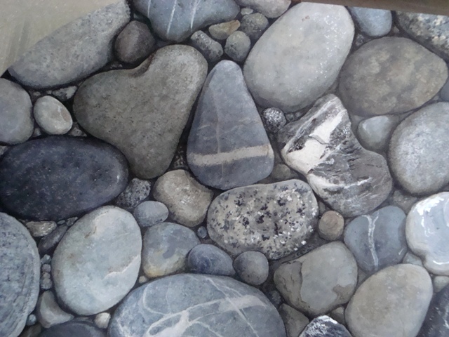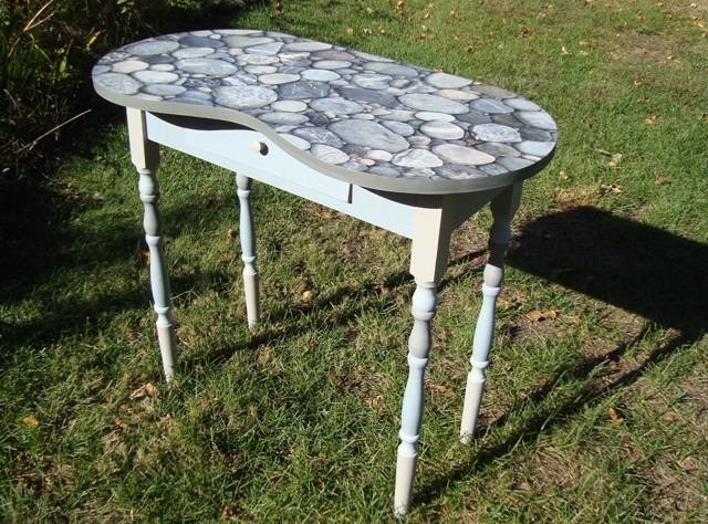 What a joy it was to paint this table! I worked from real stones and photographs of real stones. It was a challenge to make the randomness of the stones both natural and artistically placed. Painting realistic stones takes a combination of technique, patience and old brushes that can be handled ‘roughly.’ Doing the stripes that naturally occur in some stones is not easy, if done wrong the stripe would seem painted’ on the outside. The client requested “No pink or brown stones”, but the piece needed the hints of rust, yellow and green or else the all gray palette would have been too cold. Of course there has to be a bug on the stones! A delicate Damselfly was perfect for what appears to be a scene from the water’s edge. Everyone who has seen this table points to a different stone as their favorite. Which one is your favorite? I painted the legs in four alternating shades of gray. When this table was originally brought to me it was painted an ugly bright yellow, what a transformation!