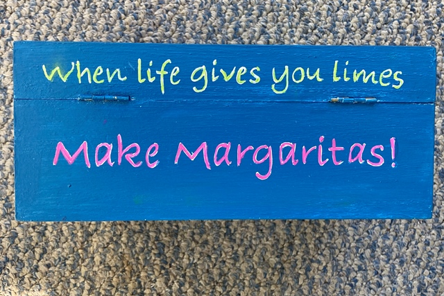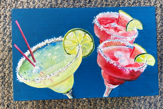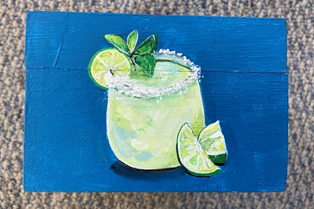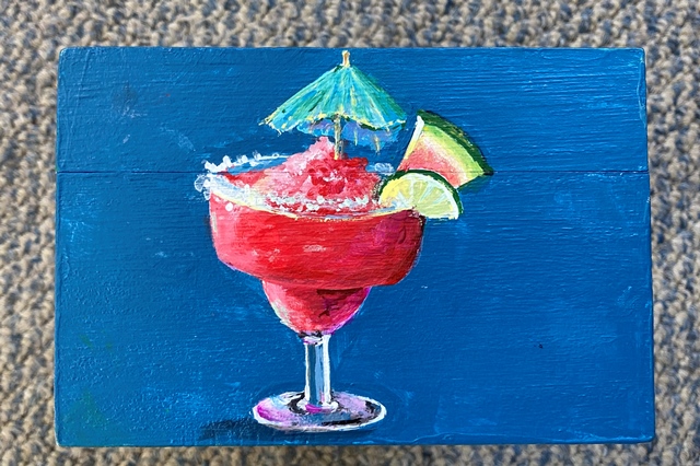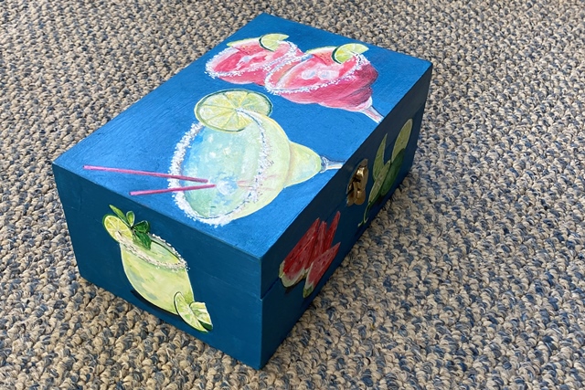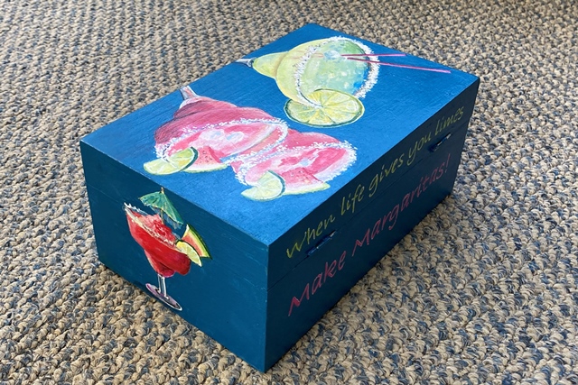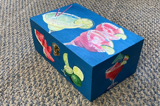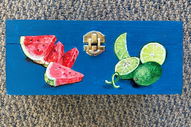 This wooden file box was a commission for a lover of Margaritas, especially the watermelon variety. I really enjoy painting fruit!